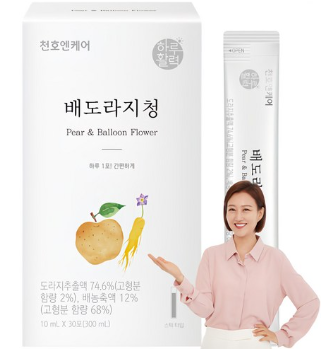 천호엔케어 하루활력 배도라지청은 국내산 생도라지와 배를 주원료로 하여 기관지 건강에 도움을 줄 수 있도록 개발된 스틱형 건강식품입니다. 바쁜 현대인들을 위해 간편하게 섭취할 수 있도록 스틱 형태로 포장되어 있으며, 따뜻한 물에 타서 차처럼 마시거나 그대로 섭취할 수 있습니다. 특히 겨울철과 환절기에 기침, 가래 등으로 고생하는 분들에게 추천하며, 면역력 강화에도 도움을 줄 수 있는 제품입니다.
